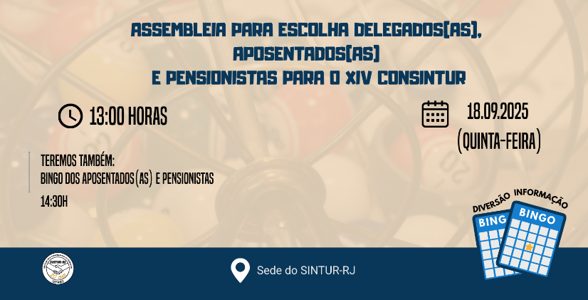 A Comissão Organizadora, no uso de suas atribuições legais e de acordo com os artigos 14° a 23° do Estatuto, altera a data do XIV CONSINTUR e convoca os(as) técnico-administrativos(as) associados(as) do SINTUR-RJ para participarem do congresso, que será realizado nos dias 29, 30 e 31 de outubro de 2025, em local a ser definido pela Comissão Organizadora.