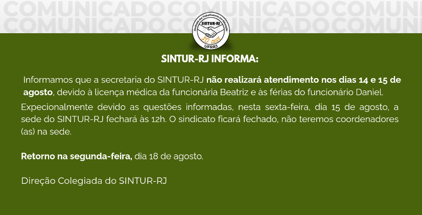 Informamos que a secretaria do SINTUR-RJ não realizará atendimento nos dias 14 e 15 de agosto, devido à licença médica da funcionária Beatriz e às férias do funcionário Daniel.