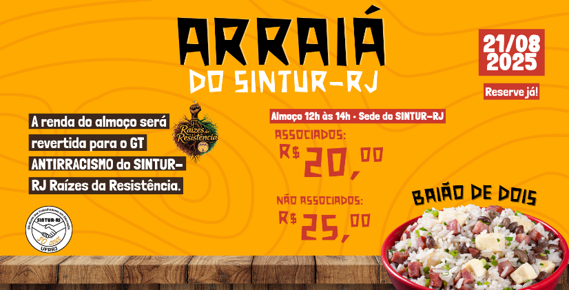 Expecionalmente devido as questões informadas, nesta sexta-feira, dia 15 de agosto, a sede do SINTUR-RJ fechará às 12h. O sindicato ficará fechado, não teremos coordenadores(as) na sede.