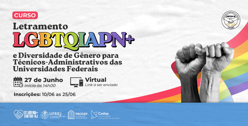 O SINTUR-RJ convida todas as pessoas a participarem do curso de Letramento LGBTQIA+ e Diversidade de Gênero para Técnicos-Administrativos das Universidades Federais.