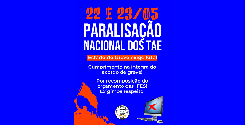 Conforme orientação nacional da FASUBRA,a assembleia da categoria realizada no dia 15 de maio aprovou por unanimidade que os dias 22 e 23 de maio serão de Paralisação Nacional dos TAE!
